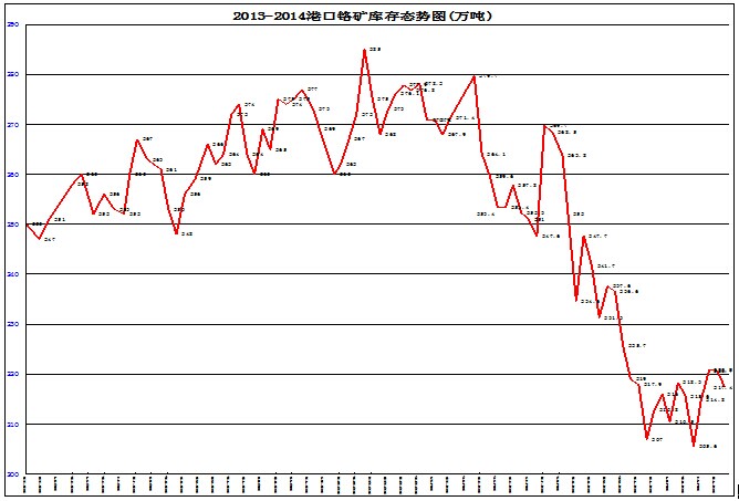 4、庫存新低。2014年以來,融資更加困難,被貼上“高能耗、高污染”標簽的鉻鐵生產(chǎn)出現(xiàn)行業(yè)性虧損的苗頭后,更難從銀行獲得直接融資。鉻鐵廠家被迫壓縮礦石采購數(shù)量,盡量減少港口堆存費用,導(dǎo)致中國港口的鉻礦庫存一再下降,包括重慶港在內(nèi)的庫存數(shù)字已經(jīng)下降到220萬噸以下。不難想象,現(xiàn)貨采購的選擇減少,現(xiàn)貨降價的動力減弱。
