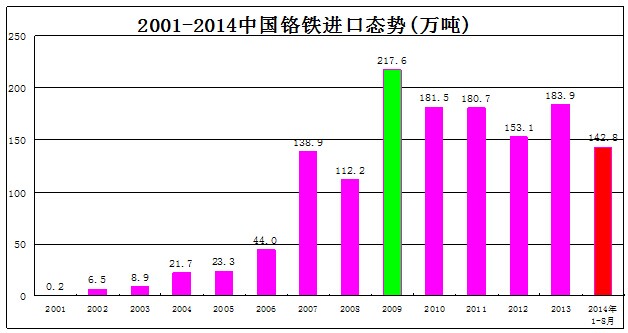 1、全球產(chǎn)量井噴。2013年出現(xiàn)了全球性鉻鐵設(shè)備大建設(shè)高潮,2014年迎來了全球性鉻鐵產(chǎn)量大增長井噴。信息顯示,南非MERAFE上半年的鉻鐵產(chǎn)量同比增長23%,產(chǎn)能利用率同比增長64%。南非IFM的鉻鐵產(chǎn)量增長24%,南非的其它鉻鐵廠家借助電力回購取消也紛紛擴大了生產(chǎn)。中國1-8月累計進口南非鉻鐵94.5萬噸,比2013年同期55.4萬噸增長70.6%。津巴布韋鉻鐵在中國各類生產(chǎn)性投資的推動下,前8個月中國買家已累計進口65879噸,比2013年1-8月的22381噸增長194%。