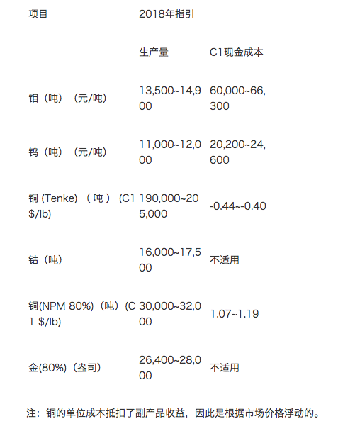 2018年公司公布的主要產(chǎn)品產(chǎn)量及現(xiàn)金成本指引如下: