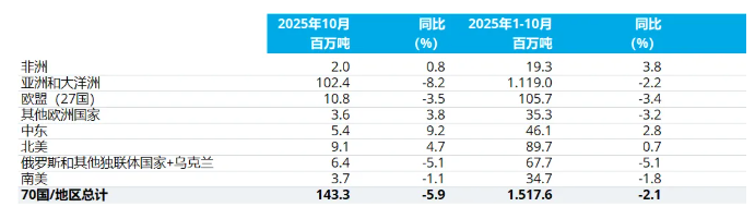 2025年10月全球70個(gè)納入世界鋼鐵協(xié)會(huì)統(tǒng)計(jì)國(guó)家/地區(qū)的粗鋼產(chǎn)量為1.433億噸,同比下降5.9%。