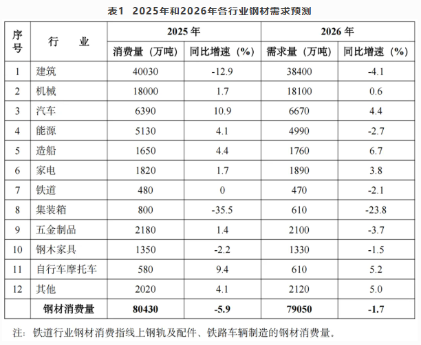 2026年,我國將持續(xù)擴(kuò)大內(nèi)需,繼續(xù)實(shí)施更加積極的財(cái)政政策和適度寬松的貨幣政策,打好政策“組合拳”,為鋼材需求總體穩(wěn)定提供有效支撐。預(yù)測2026年汽車、造船、家電、自行車摩托車等行業(yè)鋼材需求呈增長態(tài)勢,建筑、集裝箱、五金制品等行業(yè)鋼材需求下降,綜合預(yù)測2026年我國鋼材需求量將小幅下降。2025年和2026年各行業(yè)鋼材需求預(yù)測見表1。
