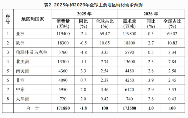 根據(jù)對全球及各地區(qū)經(jīng)濟(jì)發(fā)展與鋼材需求量分析,預(yù)計(jì)2025年全球鋼材消費(fèi)量為17.19億噸,同比下降1.8%;預(yù)測2026年全球鋼材需求量為17.36億噸,同比增長1.0%。2025年和2026年全球主要地區(qū)鋼材需求預(yù)測見表2。