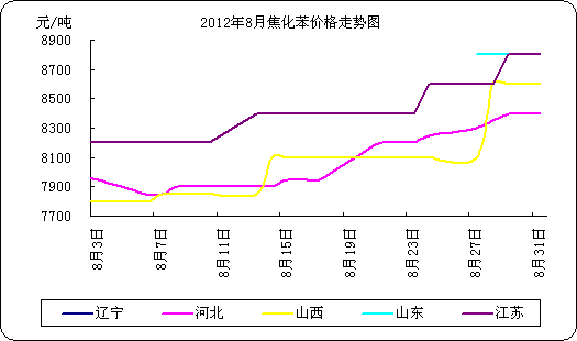 8月下旬,加氫苯上漲,貨源緊張。加氫苯企業(yè)整體開(kāi)工率不高,貨源不多。市場(chǎng)影響因素動(dòng)態(tài):國(guó)際原油震蕩上揚(yáng);亞洲外盤(pán)純苯窄幅震蕩上行;中石化欲上調(diào)石油苯掛價(jià);原料粗苯貨源緊張,價(jià)格上漲;焦化苯貨源稀少,小幅上探;苯乙烯華東市場(chǎng)10800元/噸持穩(wěn)為主;順酐隨原料苯上漲,企業(yè)降負(fù)荷生產(chǎn)以減少虧損,產(chǎn)品庫(kù)存不大,市場(chǎng)需求疲軟。加氫苯成交(現(xiàn)匯):山西8450-8550元/噸,河北8500-8600元/噸,山東8600-8700元/噸,河南8600-8700元/噸,湖北8400-8700元/噸出廠;華東8800元/噸到廠。