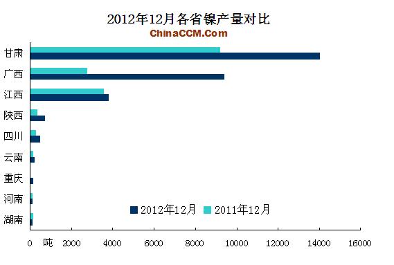 國(guó)內(nèi)各省鎳產(chǎn)量2012年12月與2011年12月對(duì)比: