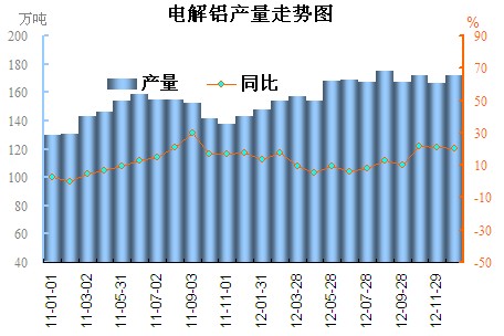 本周電解鋁較上周追跌50元,均價在14946元/噸,價格低產(chǎn)能過剩難逃其責(zé)。2012年全國電解鋁產(chǎn)能達(dá)2687.8萬噸,產(chǎn)量2195.5萬噸,電解鋁行業(yè)的產(chǎn)能嚴(yán)重過剩。近年來的市場消費(fèi)保持穩(wěn)定,但產(chǎn)能的擴(kuò)張依舊,由于新建擴(kuò)產(chǎn),2013年國內(nèi)市場的新增供應(yīng)壓力依然較大。意見的出臺或會加快這部分市場的退出。下圖是2012年12月份電解鋁產(chǎn)量對比走勢: