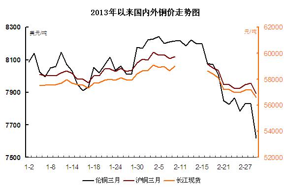 中華商務網訊:本周,歐元弱勢調整,美元持續(xù)沖高,銅等基本金屬在庫存普遍走高的情況下維持下挫之勢,倫銅來到7600美元/噸一線,國內現貨銅價再指向56000元/噸平臺。宏觀面上,歐元區(qū)喜憂參半——經濟景氣指數好于預期,加之2月制造業(yè)PMI持穩(wěn),但周中意大利大選僵局令市場對歐洲經濟擔憂;美國方面利空更多——四季度GDP不及預期;3月1日開始大規(guī)模自動減支,市場的避險情緒升級,雖有美聯儲主席伯南克幾次講話力挺量化寬松政策短期不會退出,但此舉對金屬價格提振非常有限。中國方面,官方PMI及匯豐PMI均創(chuàng)近幾個月低點,但仍在擴張區(qū)間,中國經濟溫和筑底氛圍不變;即將召開的全國“兩會”中對未來政策基調的預期,令大跌的市場暫時保持克制觀望。下周風險事件對市場影響不會很大,銅價跌勢或在中國“兩會”的利好中有所緩和,但仍將在弱勢中尋找支撐。