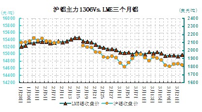 圖一 滬鋁主力VSLME三個(gè)月鋁對(duì)比走勢(shì)圖