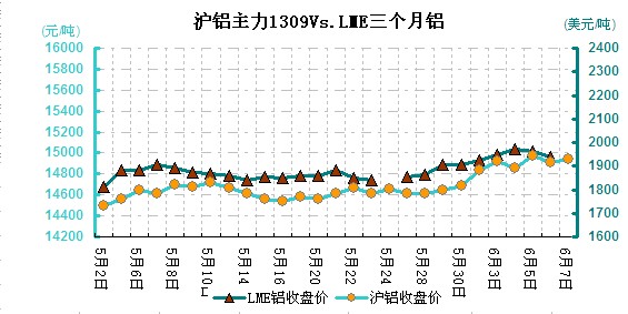 圖一 滬鋁主力1309VSLME三個(gè)月鋁對(duì)比走勢(shì)圖