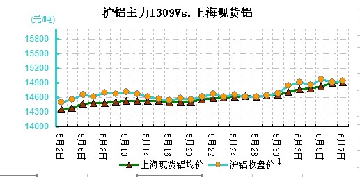 圖二 滬鋁主力1309VS現(xiàn)貨鋁價(jià)對(duì)比走勢(shì)圖