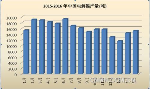 2016年3月中國電解鎳產(chǎn)量約為15170噸,較2月份產(chǎn)量14366噸增加5.9%。