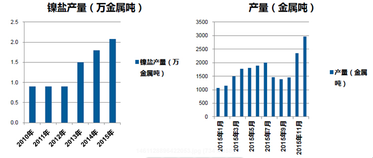 回顧近些年的硫酸鎳供需市場,硫酸鎳產(chǎn)量自2010年以后一直處于穩(wěn)定的增長,截止2015年國內(nèi)硫酸鎳年產(chǎn)量在10萬噸左右,直到2015年產(chǎn)量突破2萬金屬噸大關(guān)。從2015年月度數(shù)據(jù)來看,除卻8月-10月因價格跟隨鎳價大幅下滑,市場人氣疲軟,企業(yè)面臨虧損不得不選擇減停產(chǎn),但隨著鎳價企穩(wěn),硫酸鎳價格有所回升,加之新能源汽車市場熱度不減,硫酸鎳產(chǎn)量復(fù)蘇立竿見影。優(yōu)美科預(yù)計2016年硫酸鎳產(chǎn)量在12.5萬實物噸,2016年的產(chǎn)能約在16萬噸/年。