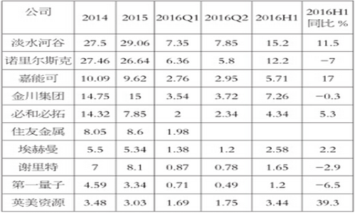 國際鎳業(yè)研究組織(INSG)數(shù)據(jù)顯示,1—5月全球鎳產(chǎn)量為80萬噸,同比減少2.3%;全球主要鎳企業(yè)2016上半年產(chǎn)量有增減,產(chǎn)量增速放緩,俄鎳、住友、金川等企業(yè)減產(chǎn)明顯。2016年上半年鎳價(jià)重心逐漸上移,從基本面看主要是因?yàn)槿蜴嚬┙o小幅減少,而需求超預(yù)期增加,需求超過供給出現(xiàn)缺口所致。