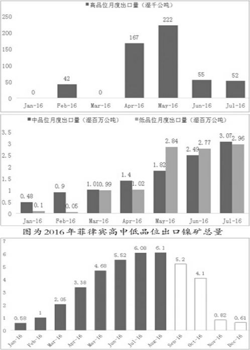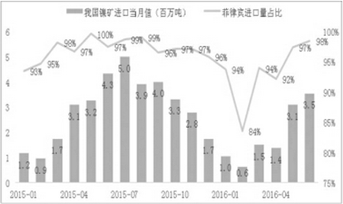 根據(jù)海關(guān)總署的數(shù)據(jù),2015年,菲律賓累計(jì)向中國出口鎳礦3428萬噸,約占中國進(jìn)口鎳礦總量的97.17%,約占菲律賓鎳礦總出口量的75.6%;2016年上半年,菲律賓累計(jì)向中國出口鎳礦1067萬噸,占中國進(jìn)口鎳礦總量的95.8,約占菲律賓鎳礦總出口量的62%?梢娭袊欠坡少e鎳礦的第一出口國,同時(shí)菲律賓鎳礦對(duì)于中國的重要性也不言而喻。