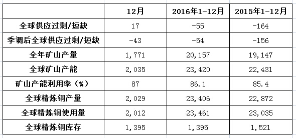 國際銅研究小組(ICSG)周一(3月20日)發(fā)布月報顯示,2016年12月全球銅市供應過剩17,000噸,全年則供應短缺55,000噸,遠低于2015年全年的供應短缺164,000噸。