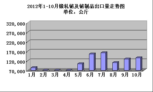 2012年1-10月鍛軋鉍及鉍制品出口量走勢圖