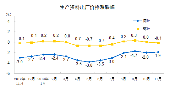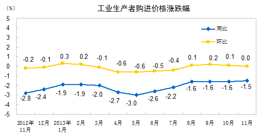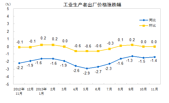 2013年11月份,全國工業(yè)生產者出廠價格同比下降1.4%,環(huán)比持平(漲跌幅度為0,下同)。工業(yè)生產者購進價格同比下降1.5%,環(huán)比持平。1-11月平均,工業(yè)生產者出廠價格同比下降2.0%,工業(yè)生產者購進價格同比下降2.1%。