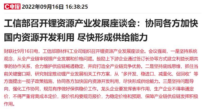 財聯(lián)社記者從工信部官網(wǎng)獲悉,9月15日,工業(yè)和信息化部原材料工業(yè)司組織召開鋰資源產(chǎn)業(yè)發(fā)展座談會,會議強調(diào)三個事項,其中龍頭企業(yè)要發(fā)揮表率作用,生產(chǎn)企業(yè)不得串通定價,不得嚴重背離成本定價,報價機構要規(guī)范報價,為穩(wěn)定價格和預期、保障產(chǎn)業(yè)鏈供應鏈發(fā)揮積極作用。