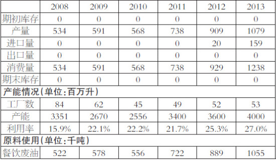 目前全國生物柴油生產(chǎn)廠家有50多家,總產(chǎn)能已經(jīng)超過350萬噸。據(jù)不完全統(tǒng)計,現(xiàn)產(chǎn)能超過10萬噸的生物柴油企業(yè)有16家,最大規(guī)模為30萬噸,山東省為生產(chǎn)企業(yè)數(shù)量最多的省份,其次為江蘇、河北和廣東。除了現(xiàn)有產(chǎn)能外,中國還有多項生物柴油項目正在建設(shè),累計約為180萬噸。但從產(chǎn)量上看,產(chǎn)能利用率僅在20%—25%。