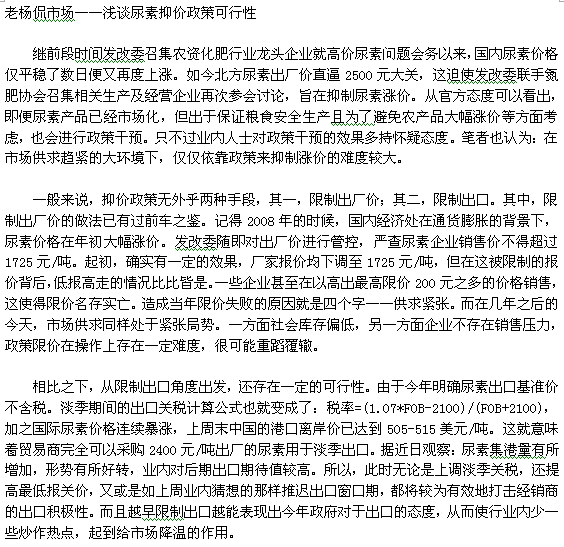 繼前段時間發(fā)改委召集農(nóng)資化肥行業(yè)龍頭企業(yè)就高價尿素問題會務(wù)以來,國內(nèi)尿素價格僅平穩(wěn)了數(shù)日便又再度上漲…… |