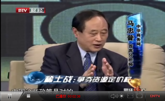 2012年4月8日北京電視臺財經(jīng)節(jié)目《財經(jīng)峰匯》播發(fā)了專題節(jié)目:稀土戰(zhàn):爭奪資源定價權(quán)。中華商務(wù)網(wǎng)首席分析師馬忠普作為應(yīng)邀嘉賓參加了訪談節(jié)目制作。在此之前,曾應(yīng)邀回答了編輯楊揚提出的關(guān)于稀土之爭的問題。