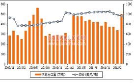 從下面鋼材進出口走勢圖可以看出,從去年四月開始我國鋼材出口已經(jīng)連續(xù)11個月呈現(xiàn)回落趨勢。