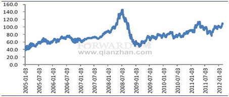 下面是2005年1月-2012年2月紐約輕質(zhì)原油期貨價(jià)格走勢(shì)(美元/桶)
