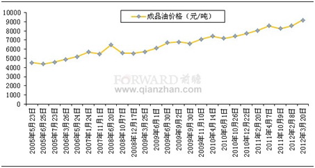 下圖是國(guó)內(nèi)成品汽柴油價(jià)格走勢(shì)